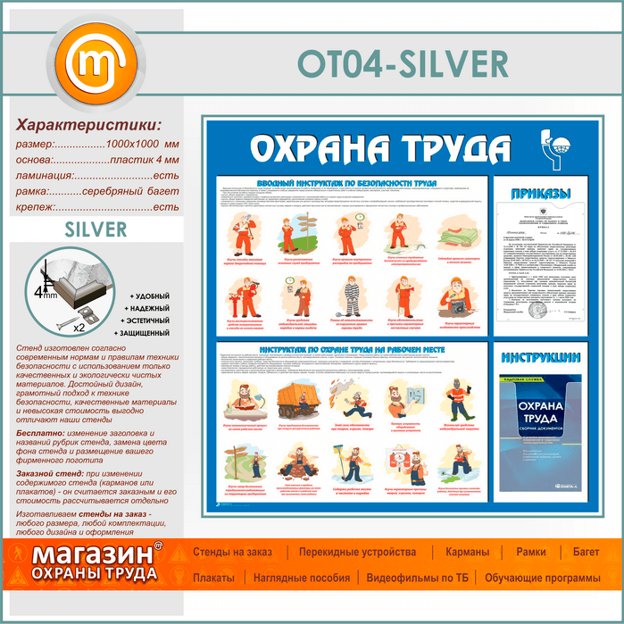 Стенд «Охрана труда» с плоским и объемным карманами (OT-04-SILVER) в Магнитогорске купить