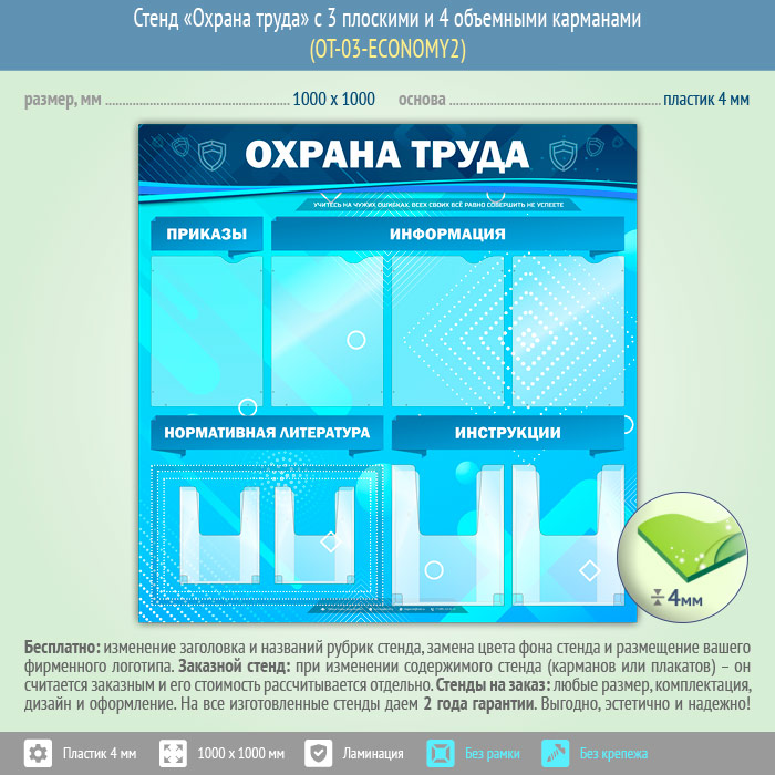 Стенд «Охрана труда» с 4 плоскими и 4 объемными карманами (OT-03-ECONOMY2) в Магнитогорске купить