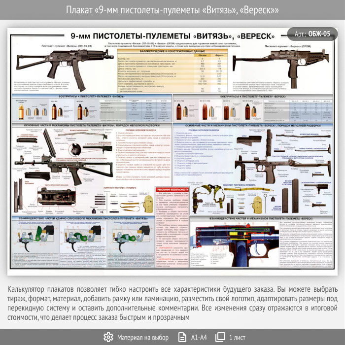 Плакат «9-мм пистолеты-пулеметы «Витязь», «Вереск»» (ОБЖ-05, 1 лист) в Магнитогорске купить