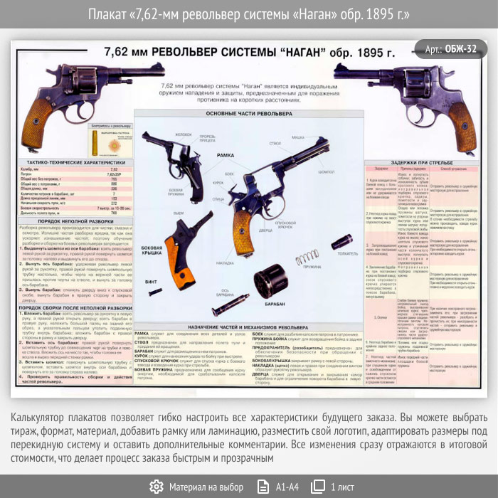 Плакат «7,62-мм револьвер системы «Наган» обр. 1895 г.» (ОБЖ-32, 1 лист) в Магнитогорске купить
