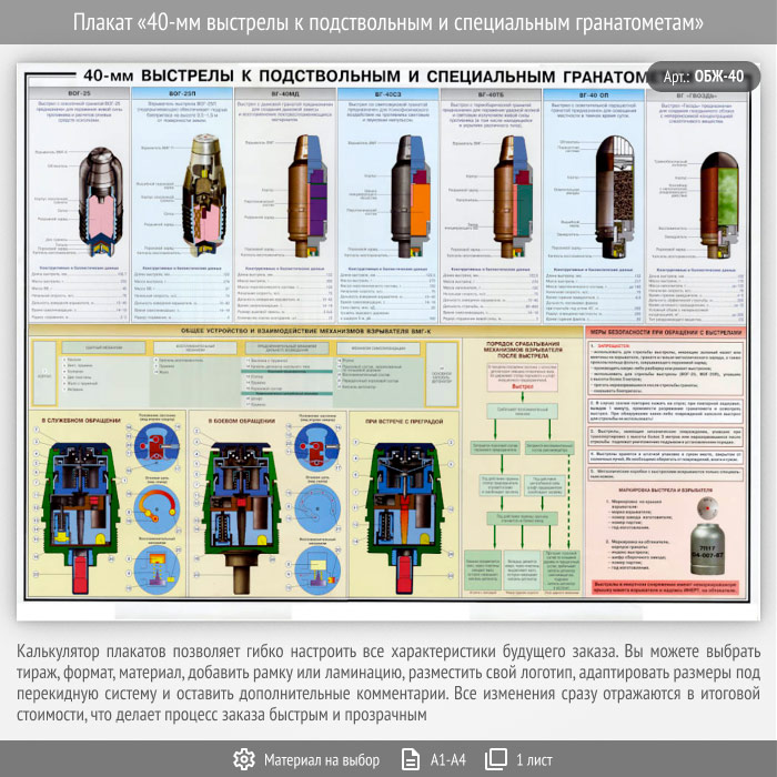 Плакат «40-мм выстрелы к подствольным и специальным гранатометам» (ОБЖ-40, 1 лист) в Магнитогорске купить
