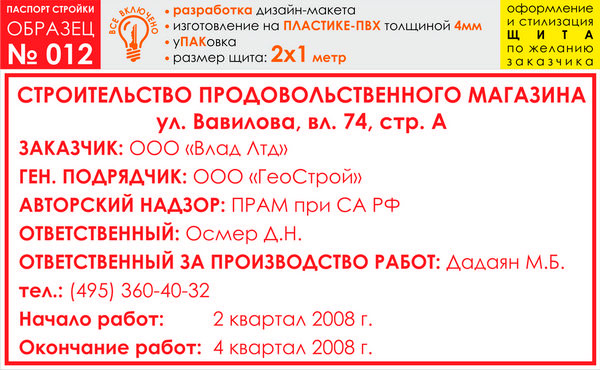 Паспорт стройки, образец № 12 (пластик 4 мм, 2000х1000 cм) в Магнитогорске купить