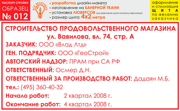 Паспорт стройки, образец № 12 (баннерная ткань, 4000х2000 cм) в Магнитогорске купить