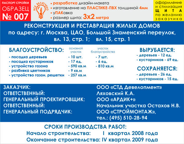 Предлагаем Вам изготовление паспорта стройки на баннерной ткани и ПВХ-пластике. В цену включены: разработка и согласование макета, изготовление и упаковка, а также НДС 18%. На данной странице представлены варианты материалов и размеров для образца № 7. Помимо представленных размеров мы можем изготовить паспорт объекта любого другого размера (цену уточняйте у менеджеров) и на любом материале (включая металл)