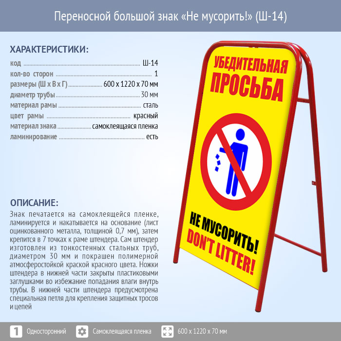 Переносной знак «Не мусорить!» (Ш-14)