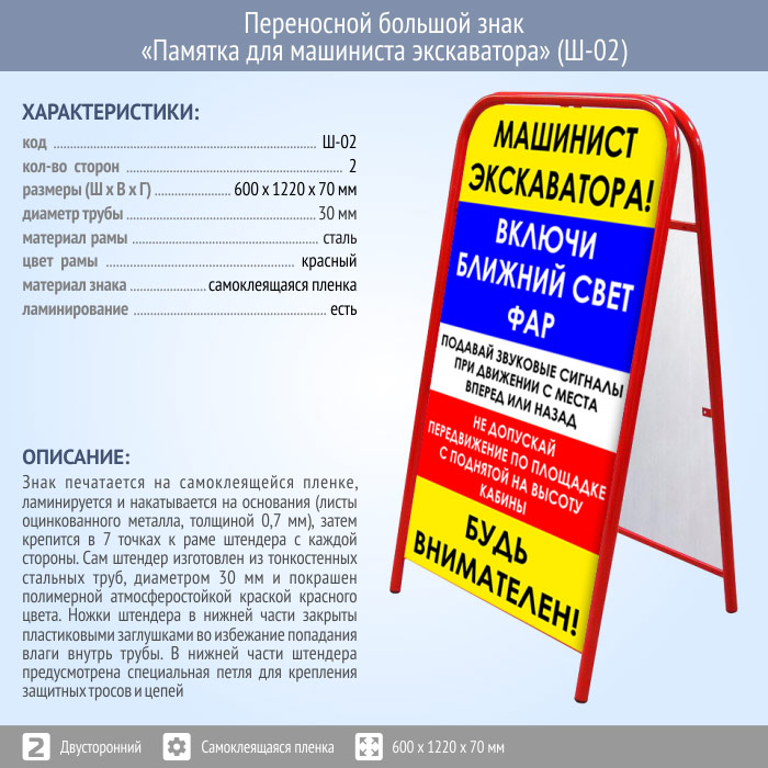 Переносной большой знак «Памятка для машиниста экскаватора» (Ш-02, двусторонний, самоклеящаяся пленка) в Магнитогорске купить
