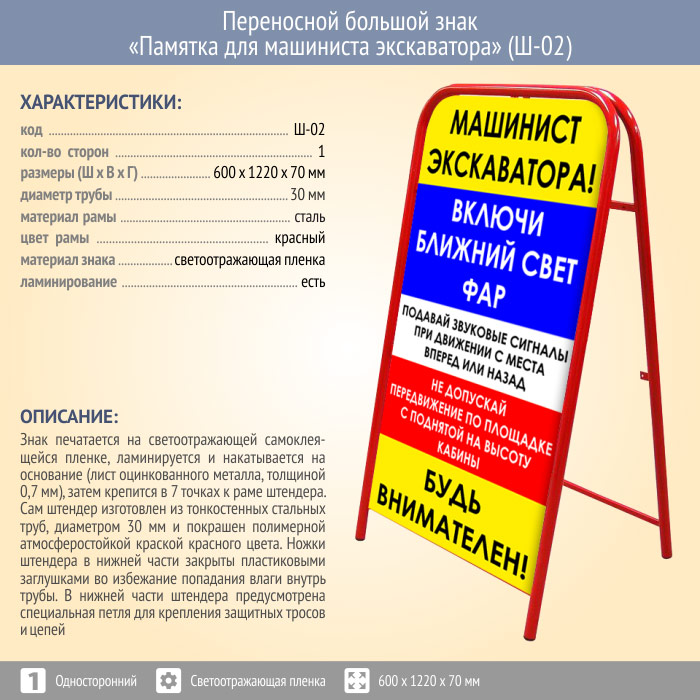Переносной большой знак «Памятка для машиниста экскаватора» (Ш-02, односторонний, светоотражающая пленка) в Магнитогорске купить