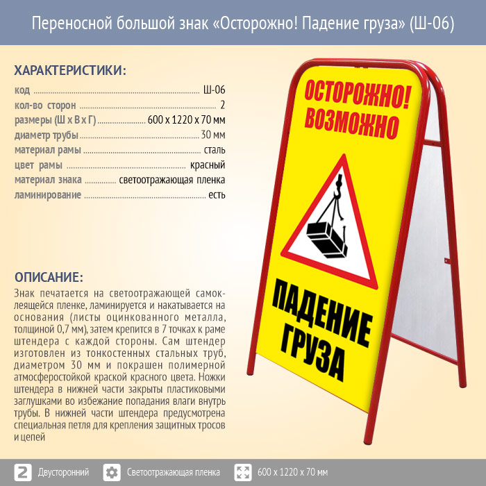 Переносной большой знак «Осторожно! Падение груза» (Ш-06, двусторонний, светоотражающая пленка) в Магнитогорске купить