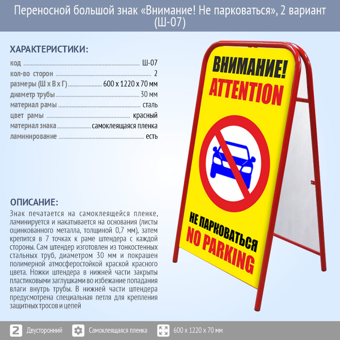 Переносной большой знак «Внимание! Не парковаться», 2 вариант (Ш-07, двусторонний, самоклеящаяся пленка) в Магнитогорске купить