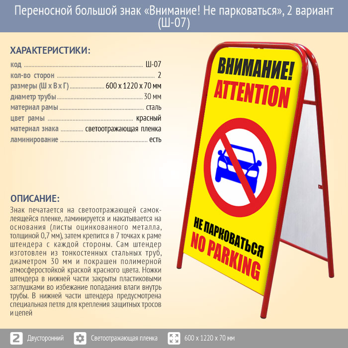 Переносной большой знак «Внимание! Не парковаться», 2 вариант (Ш-07, двусторонний, светоотражающая пленка) в Магнитогорске купить