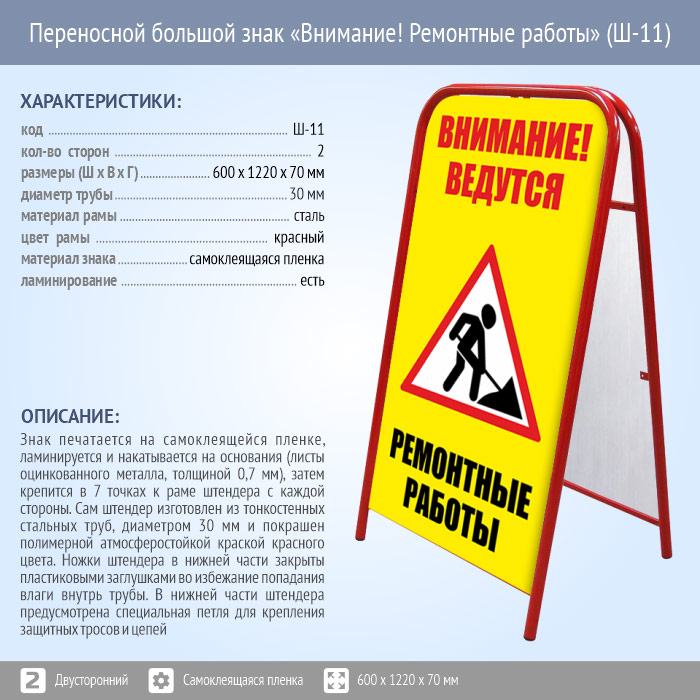 Переносной большой знак «Внимание! Ремонтные работы» (Ш-11, двусторонний, самоклеящаяся пленка) в Магнитогорске купить