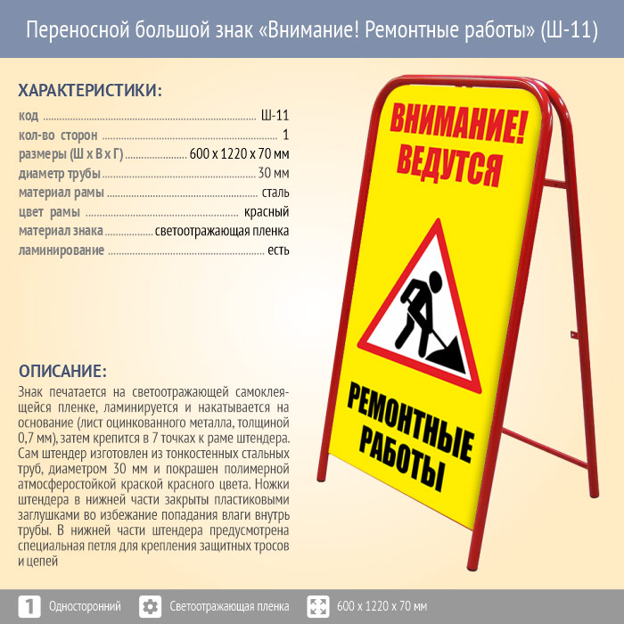 Переносной большой знак «Внимание! Ремонтные работы» (Ш-11, односторонний, светоотражающая пленка) в Магнитогорске купить
