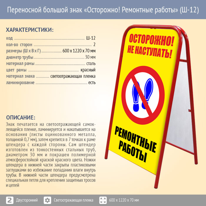Переносной большой знак «Осторожно! Ремонтные работы» (Ш-12, двусторонний, светоотражающая пленка) в Магнитогорске купить