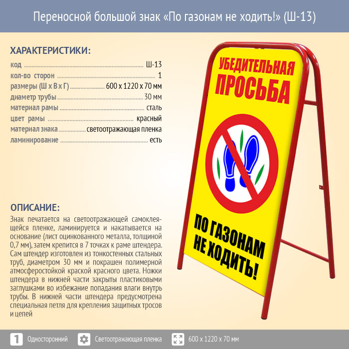 Переносной большой знак «По газонам не ходить!» (Ш-13, односторонний, светоотражающая пленка) в Магнитогорске купить
