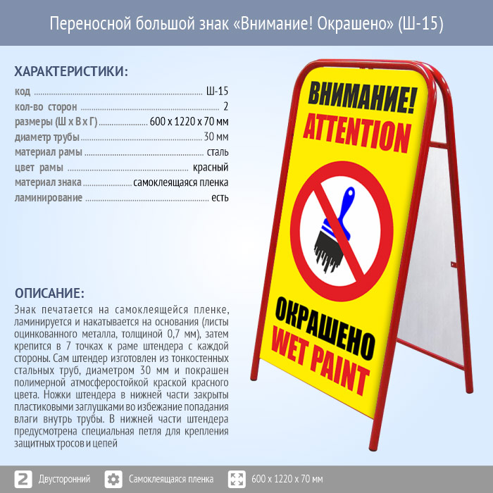 Переносной большой знак «Внимание! Окрашено» (Ш-15, двусторонний, самоклеящаяся пленка) в Магнитогорске купить