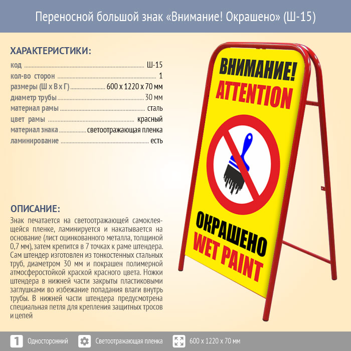 Переносной большой знак «Внимание! Окрашено» (Ш-15, односторонний, светоотражающая пленка) в Магнитогорске купить