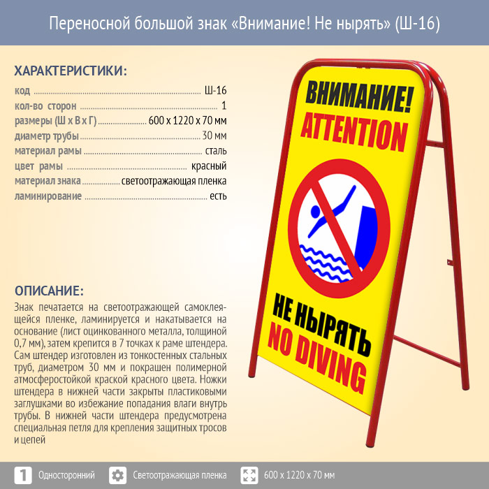 Переносной большой знак «Внимание! Не нырять» (Ш-16, односторонний, светоотражающая пленка) в Магнитогорске купить