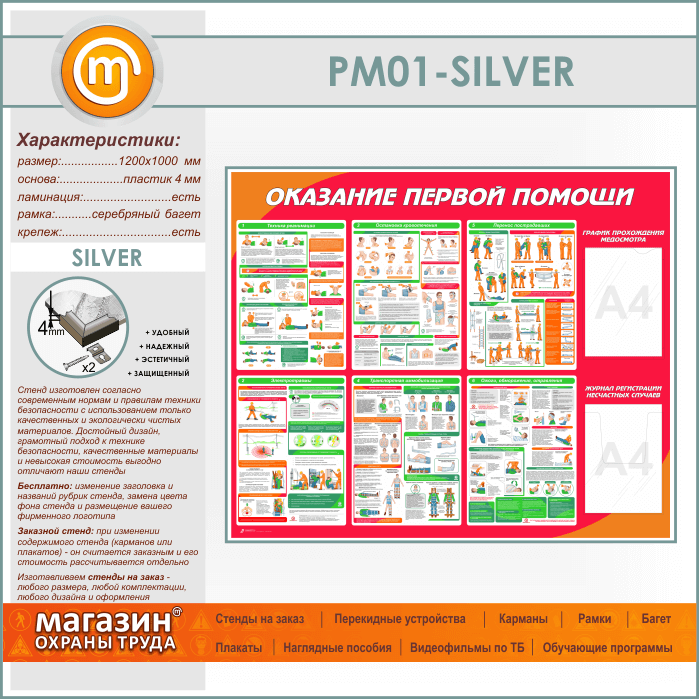 Стенд «Оказание первой помощи» с плоским и объемным карманами (PM-01-SILVER) в Магнитогорске купить