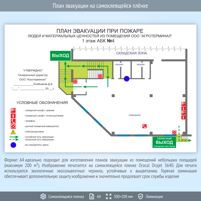 Предлагаем изготовление планов эвакуации А4-А0 форматов. В стоимость изготовления планов эвакуации на самоклеящейся плёнке входит: разработка и согласование макета, печать, ламинация