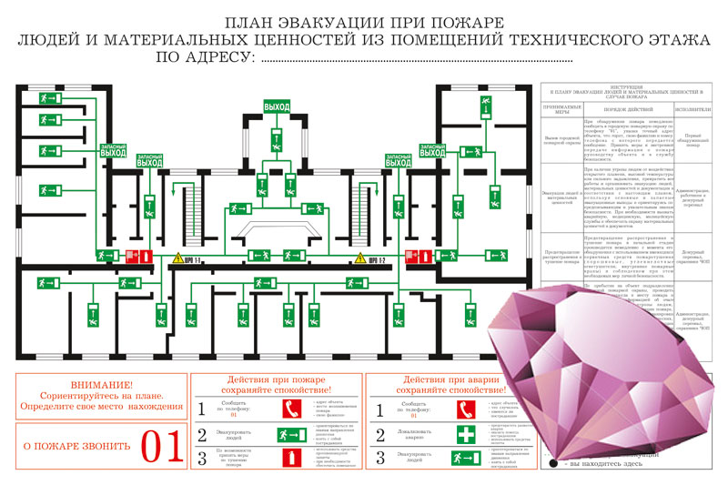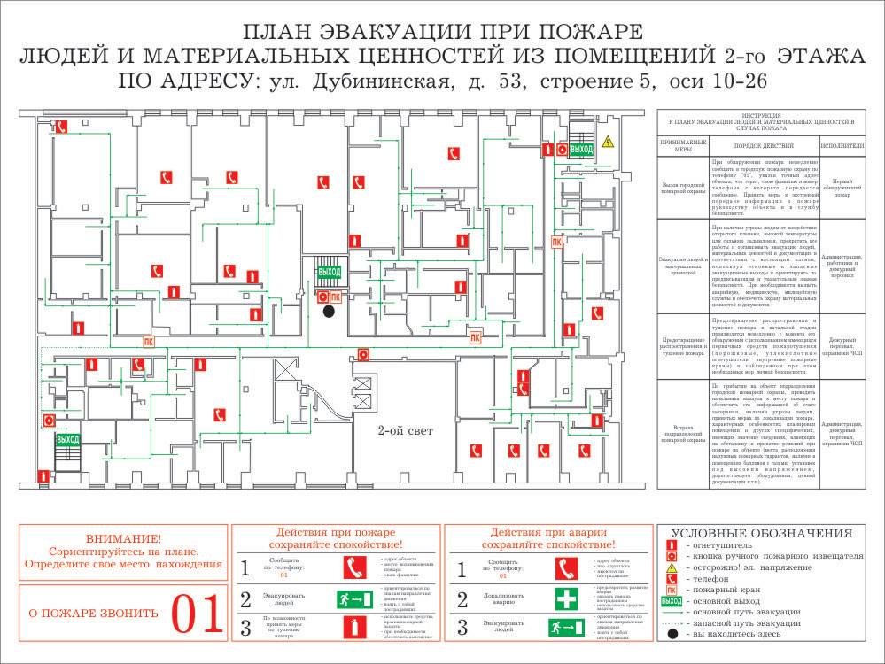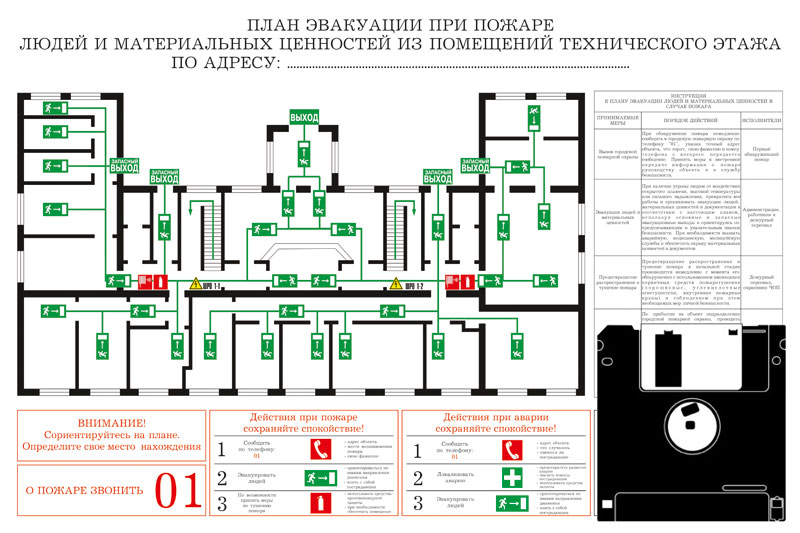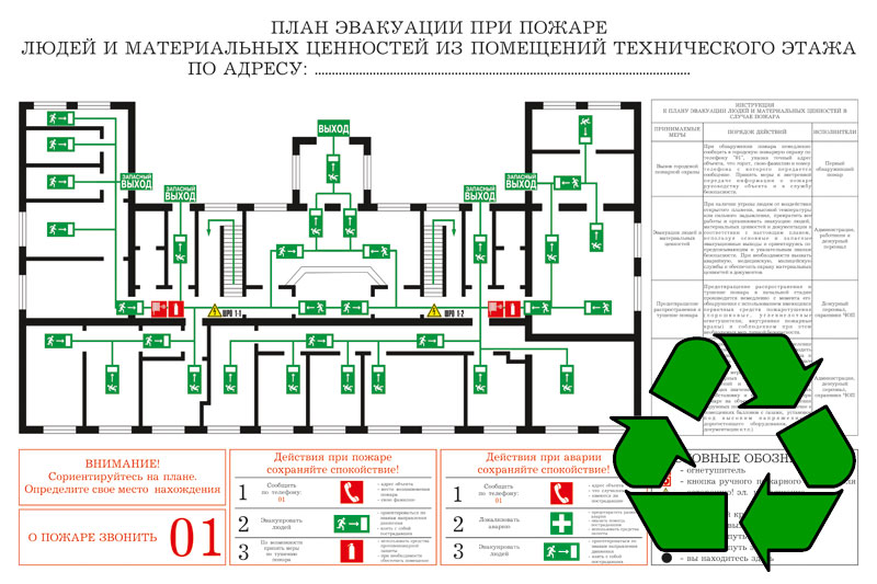 Текстовая часть планов эвакуации должна содержать инструкции о действиях в условиях чрезвычайной ситуации (при пожаре, аварии и т.п.), дополненные для наглядности знаками безопасности и символами