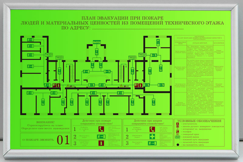 РЕДКИЙ ФОРМАТ Подходит для изготовления планов эвакуации больших площадей (до 1000 кв.м) с большим количеством пожарного инвентаря. Содержит схематичное изображение помещений с размещенными на нем средствами пожаротушения и извещения, путями эвакуации и условные обозначения. Содержит инструкцию при пожаре |