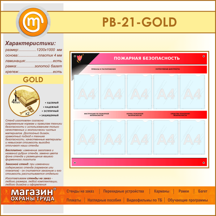 Стенд «Пожарная безопасность» с 10 карманами (PB-21-GOLD) в Магнитогорске купить
