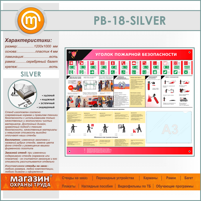 Стенд «Уголок пожарной безопасности» с карманом А3 формата (PB-18-SILVER) в Магнитогорске купить
