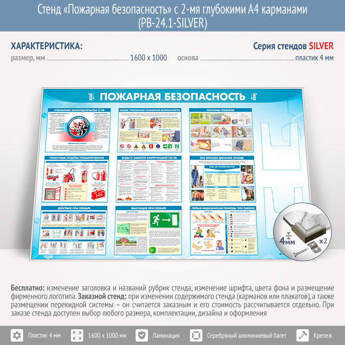 Стенд «Пожарная безопасность» с 2-мя глубокими А4 карманами (PB-24.1-SILVER) в Магнитогорске купить