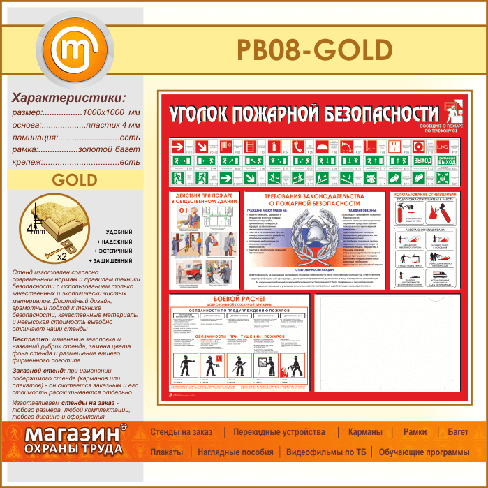 Стенд «Уголок пожарной безопасности» с карманом А3 формата (PB-08-GOLD) в Магнитогорске купить