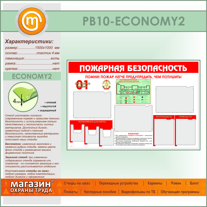 Стенд «Пожарная безопасность» с планом эвакуации, 5 плоскими и 3 объемными карманами (PB-10-ECONOMY2) в Магнитогорске купить