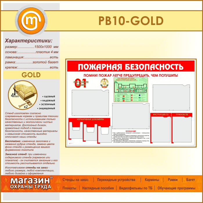 Стенд «Пожарная безопасность» с планом эвакуации, 5 плоскими и 3 объемными карманами (PB-10-GOLD) в Магнитогорске купить