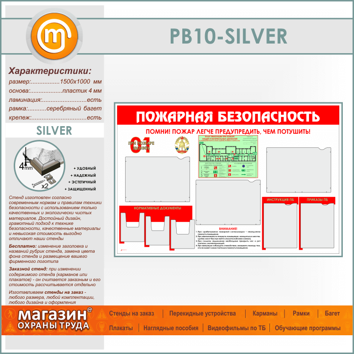 Стенд «Пожарная безопасность» с планом эвакуации, 5 плоскими и 3 объемными карманами (PB-10-SILVER) в Магнитогорске купить