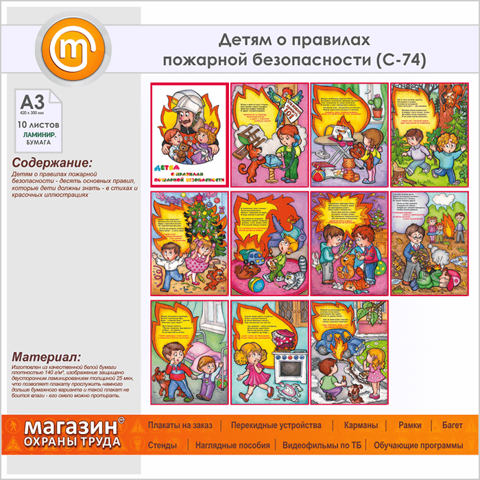 Плакаты «Детям о правилах пожарной безопасности» (С-74, ламинированная бумага, А3, 10 листов) в Магнитогорске купить