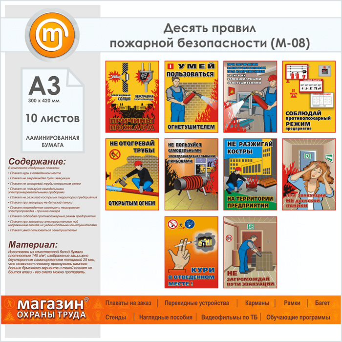 Плакаты «Десять правил пожарной безопасности» (М-08, ламинированная бумага, А3, 10 листов) в Магнитогорске купить
