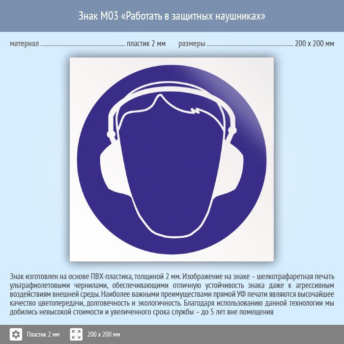 Знак M03 «Работать в защитных наушниках» (пластик, 200х200 мм) в Магнитогорске купить