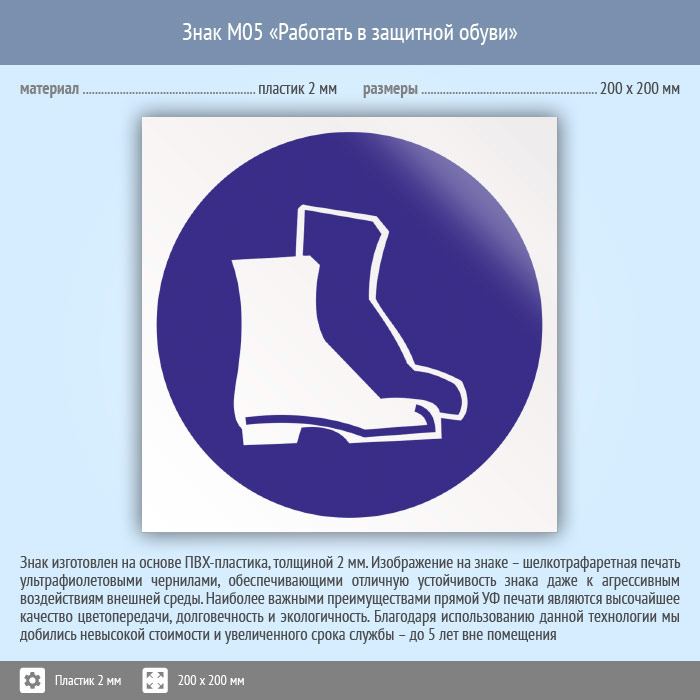 Знак M05 «Работать в защитной обуви» (пластик, 200х200 мм) в Магнитогорске купить