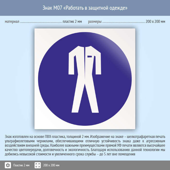 Знак M07 «Работать в защитной одежде» (пластик, 200х200 мм) в Магнитогорске купить
