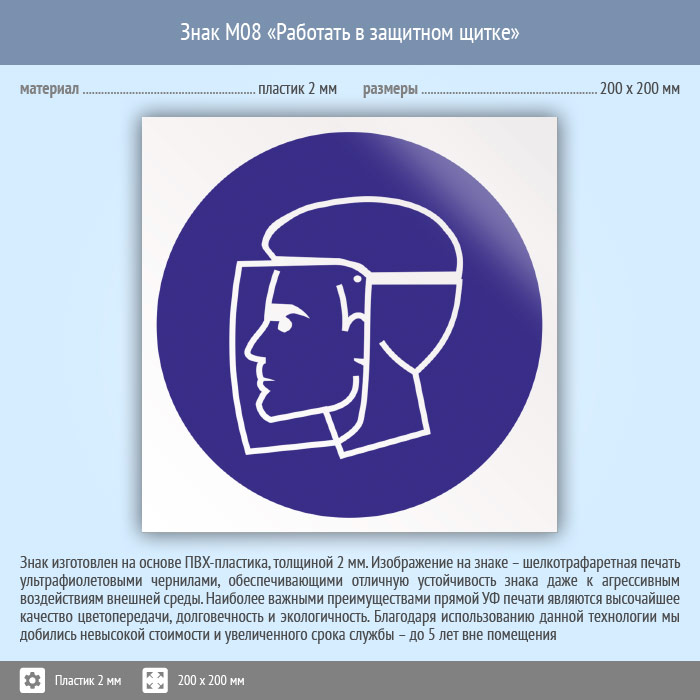 Знак M08 «Работать в защитном щитке» (пластик, 200х200 мм) в Магнитогорске купить
