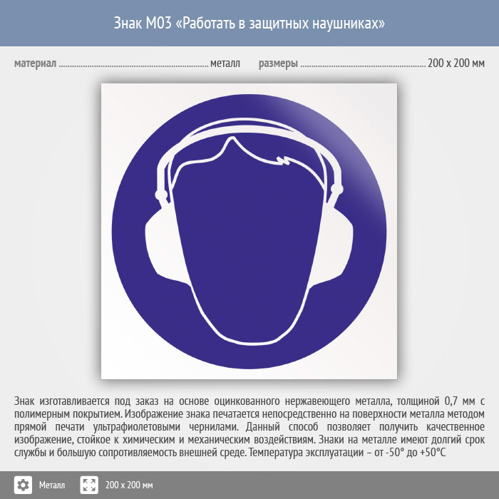 Знак M03 «Работать в защитных наушниках» (металл, 200х200 мм) в Магнитогорске купить