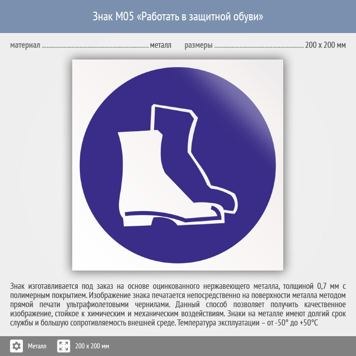 Знак M05 «Работать в защитной обуви» (металл, 200х200 мм) в Магнитогорске купить