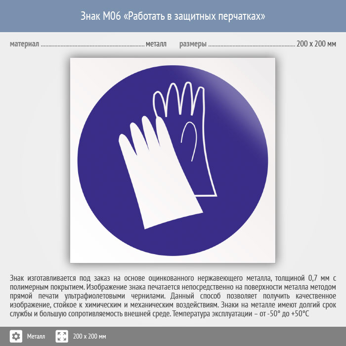 Знак M06 «Работать в защитных перчатках» (металл, 200х200 мм) в Магнитогорске купить