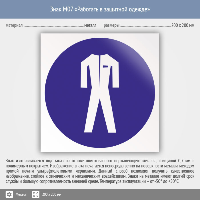 Знак M07 «Работать в защитной одежде» (металл, 200х200 мм) в Магнитогорске купить