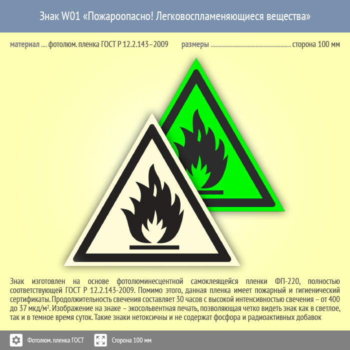 Знак W01 «Пожароопасно! легковоспламеняющиеся вещества» (фотолюминесцентная пленка ГОСТ 34428-2018, сторона 100 мм) в Магнитогорске купить