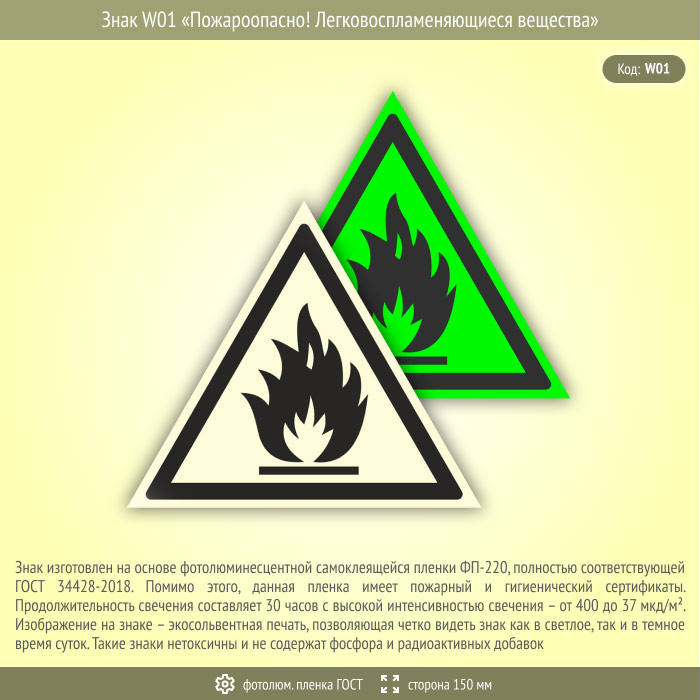 Знак W01 «Пожароопасно! легковоспламеняющиеся вещества» (фотолюминесцентная пленка ГОСТ 34428-2018, сторона 150 мм) в Магнитогорске купить
