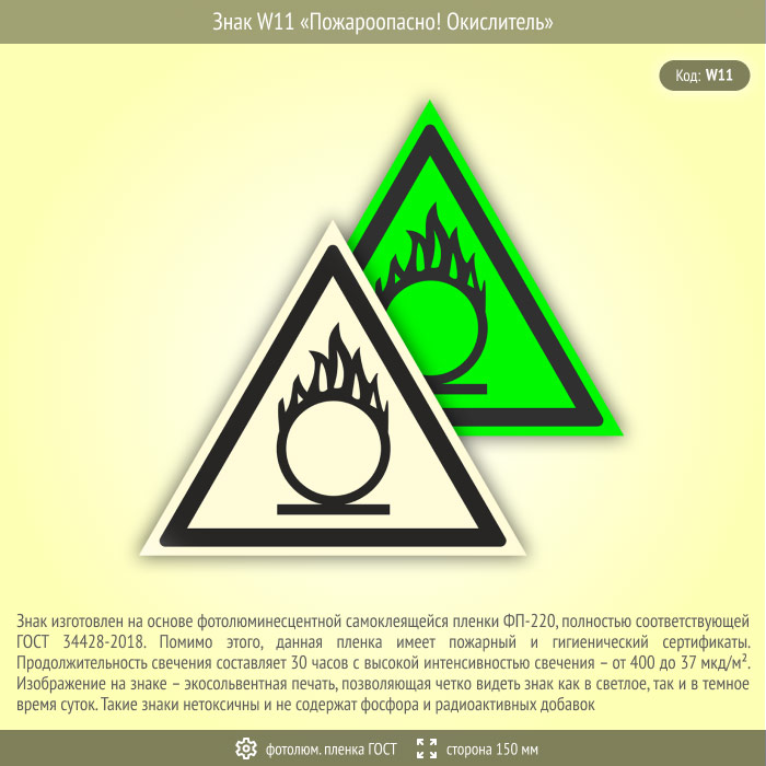 Знак W11 «Пожароопасно! окислитель» (фотолюминесцентная пленка ГОСТ 34428-2018, сторона 150 мм) в Магнитогорске купить