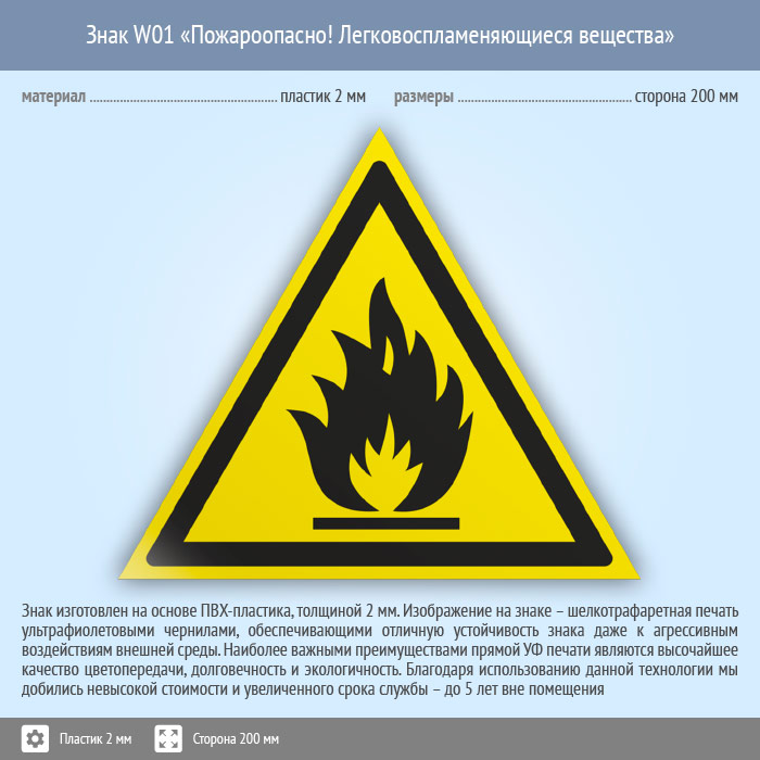 Знак W01 «Пожароопасно! легковоспламеняющиеся вещества» (пластик, сторона 200 мм) в Магнитогорске купить