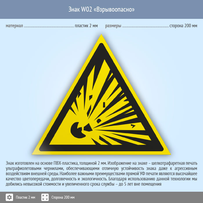 Знак W02 «Взрывоопасно» (пластик, сторона 200 мм) в Магнитогорске купить