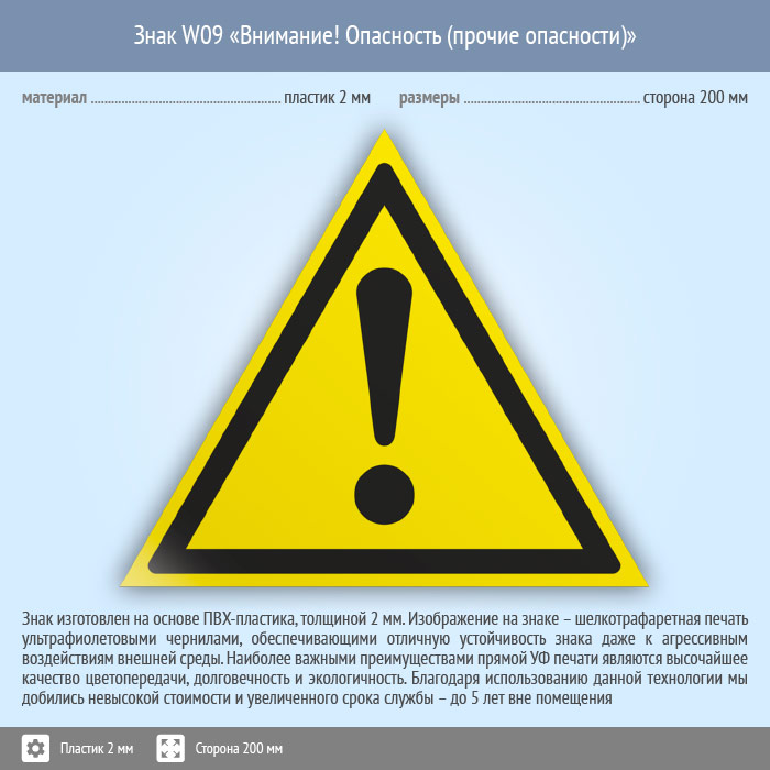 Знак W09 «Внимание! опасность (прочие опасности)» (пластик, сторона 200 мм) в Магнитогорске купить