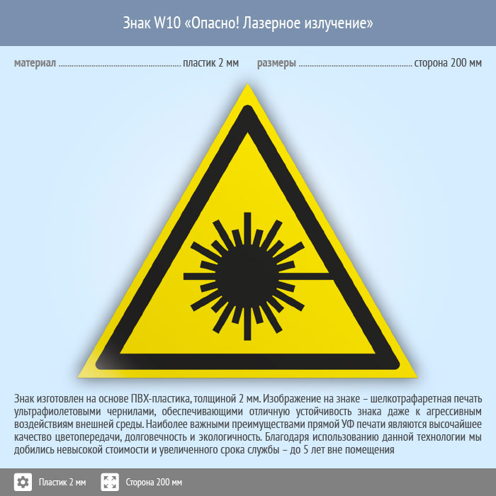 Знак W10 «Опасно! лазерное излучение» (пластик, сторона 200 мм) в Магнитогорске купить