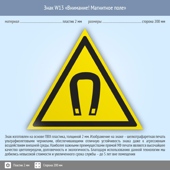 Знак W13 «Внимание! магнитное поле» (пластик, сторона 200 мм) в Магнитогорске купить